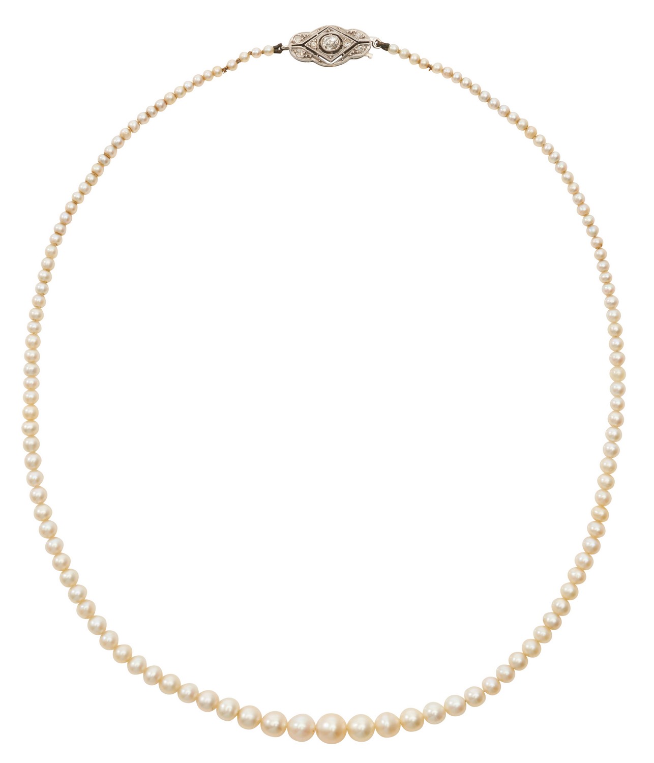 Comprising one hundred and twenty seven pearls of cream hues, measuring 2.29mm to 6.58mm, to an Art Deco diamond set clasp in 18ct white gold and platinum, signed W.D. & Co., total length 440mm.