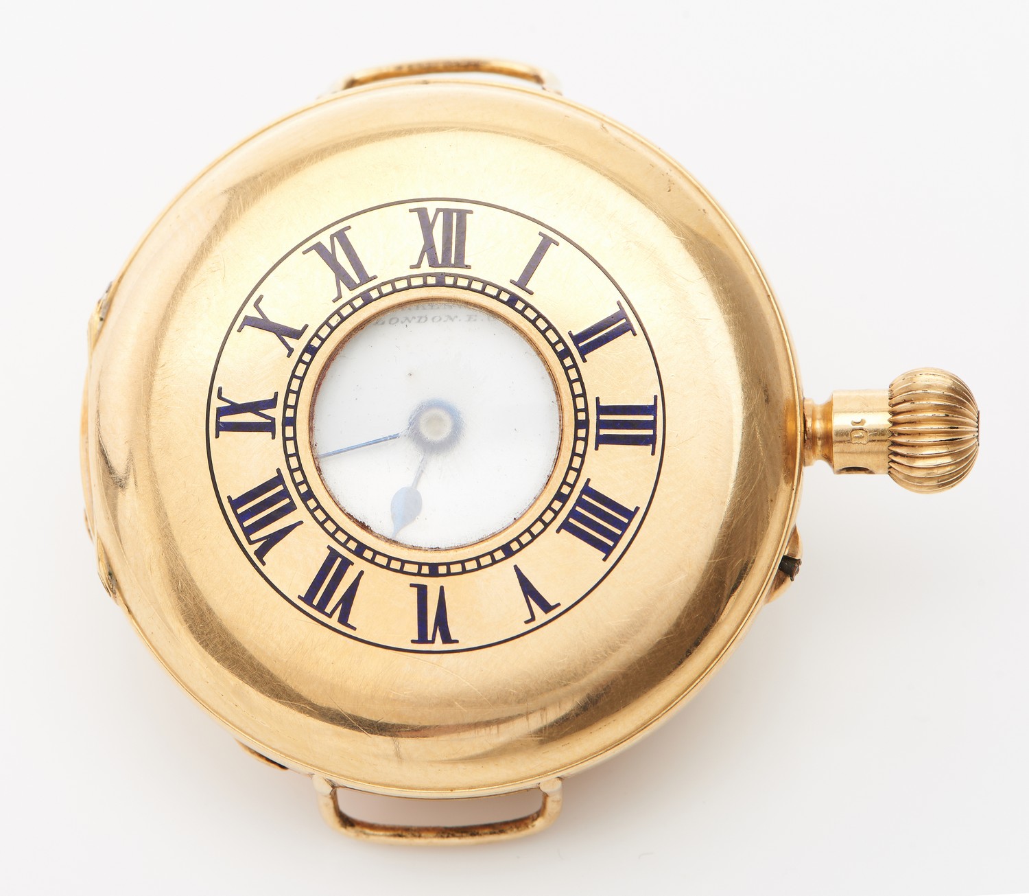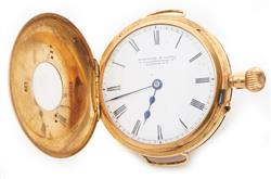 Crown wind, pin set movement, circular white dial with black Roman numerals, dial signed Masters & Leete, 4 Clerkenwell Rd, London E.C, 18ct gold case with enamel numerals to the lid and engraved intials to reverse, hallmarked London 1901, diameter 38mm.
