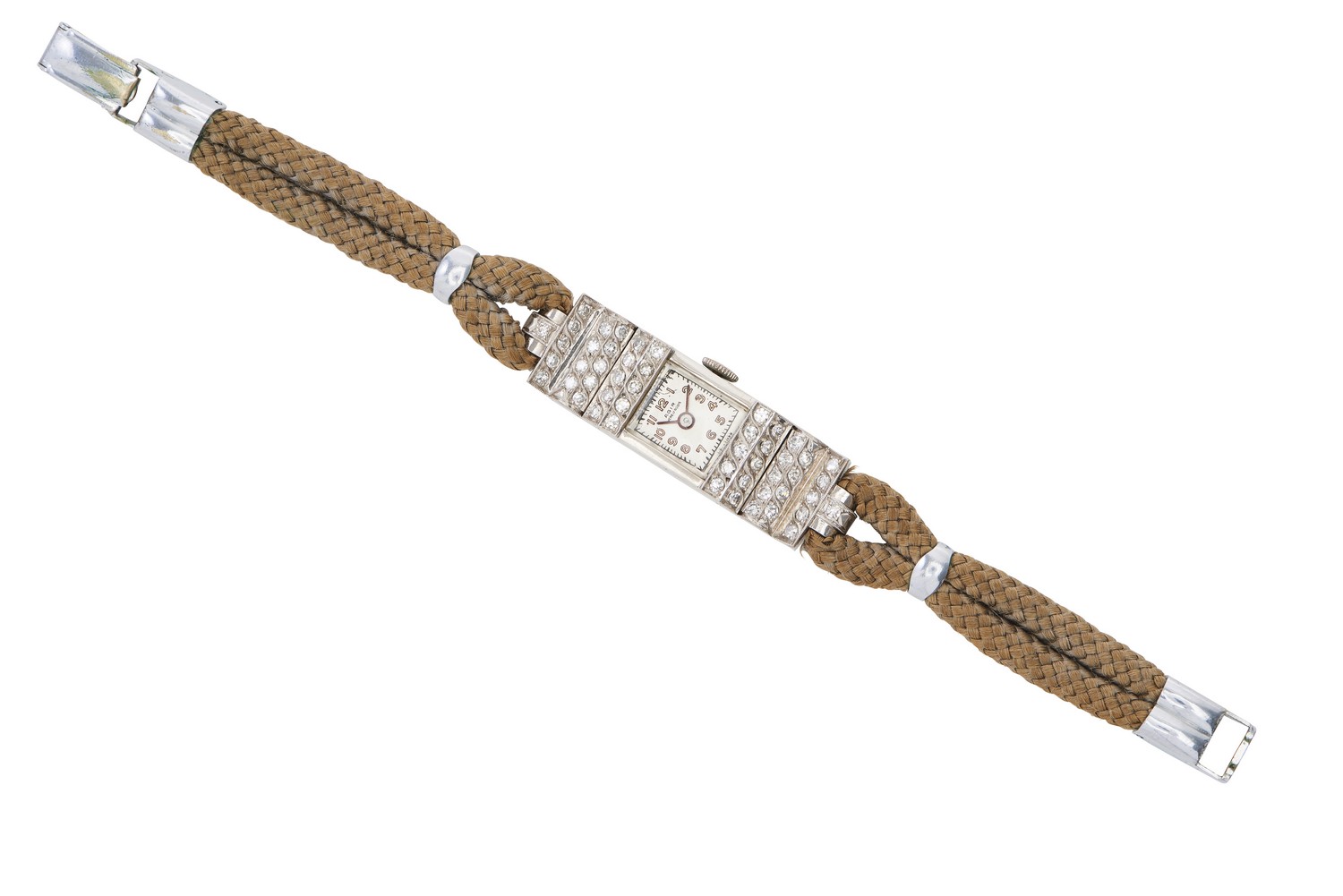 Manual wind movement, square silvered dial with gold and black Arabic numerals, diamond bezel and lugs, 18ct white gold and platinum case, to beige cordette bands, case length 40mm, total length 165mm.