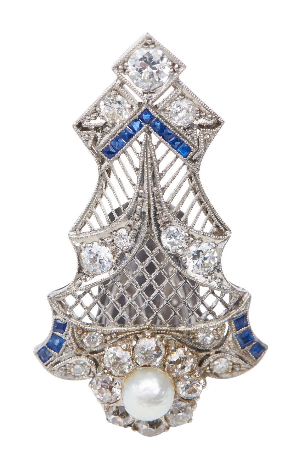 The pierced plaque featuring a pearl and diamond cluster within a detailed surround set with round brilliant and single cut diamonds and carré cut sapphires, in 18ct white gold.