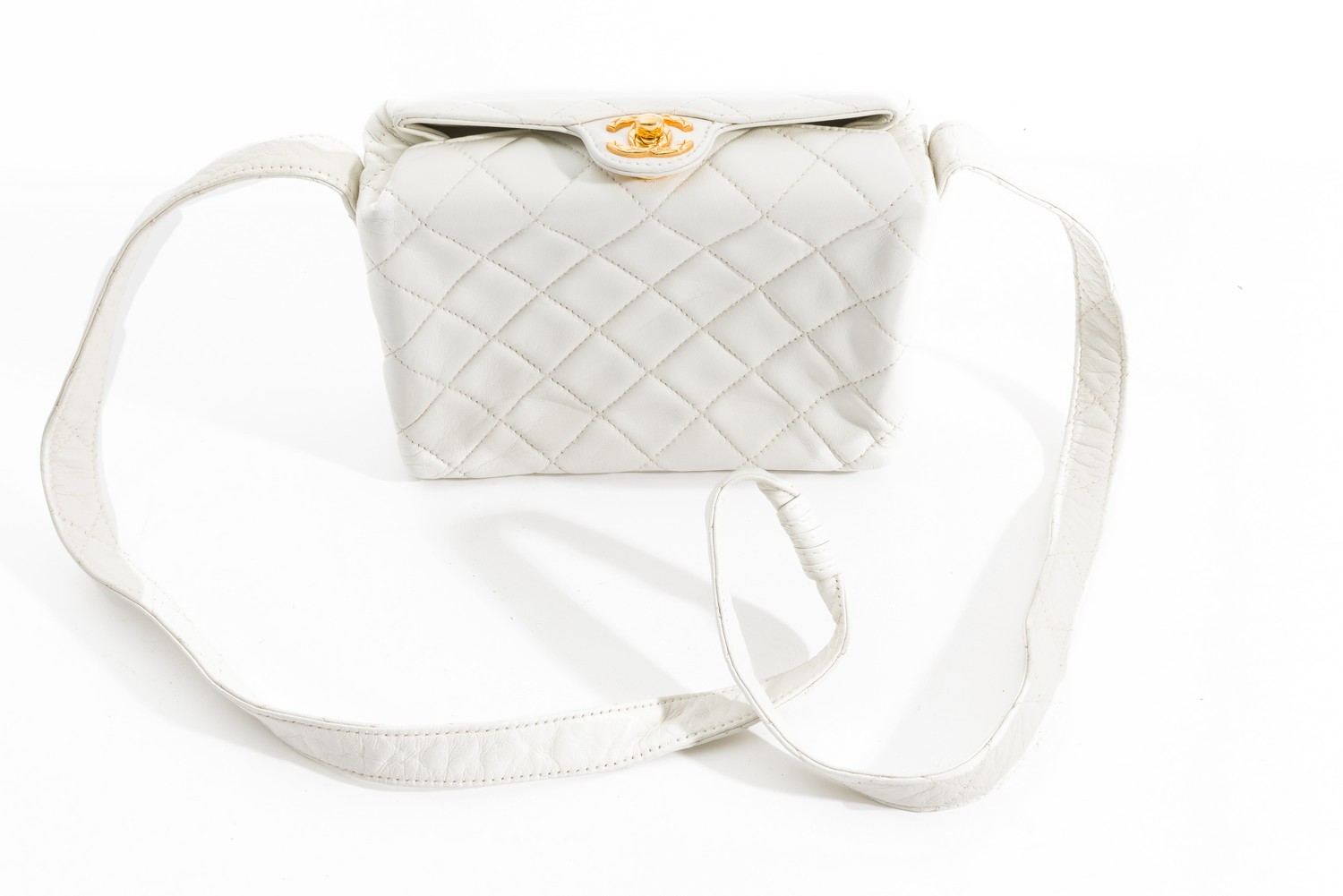 Styled in a white quilted calf leather with gold metal hardware, 14 x 17 x 6cm.