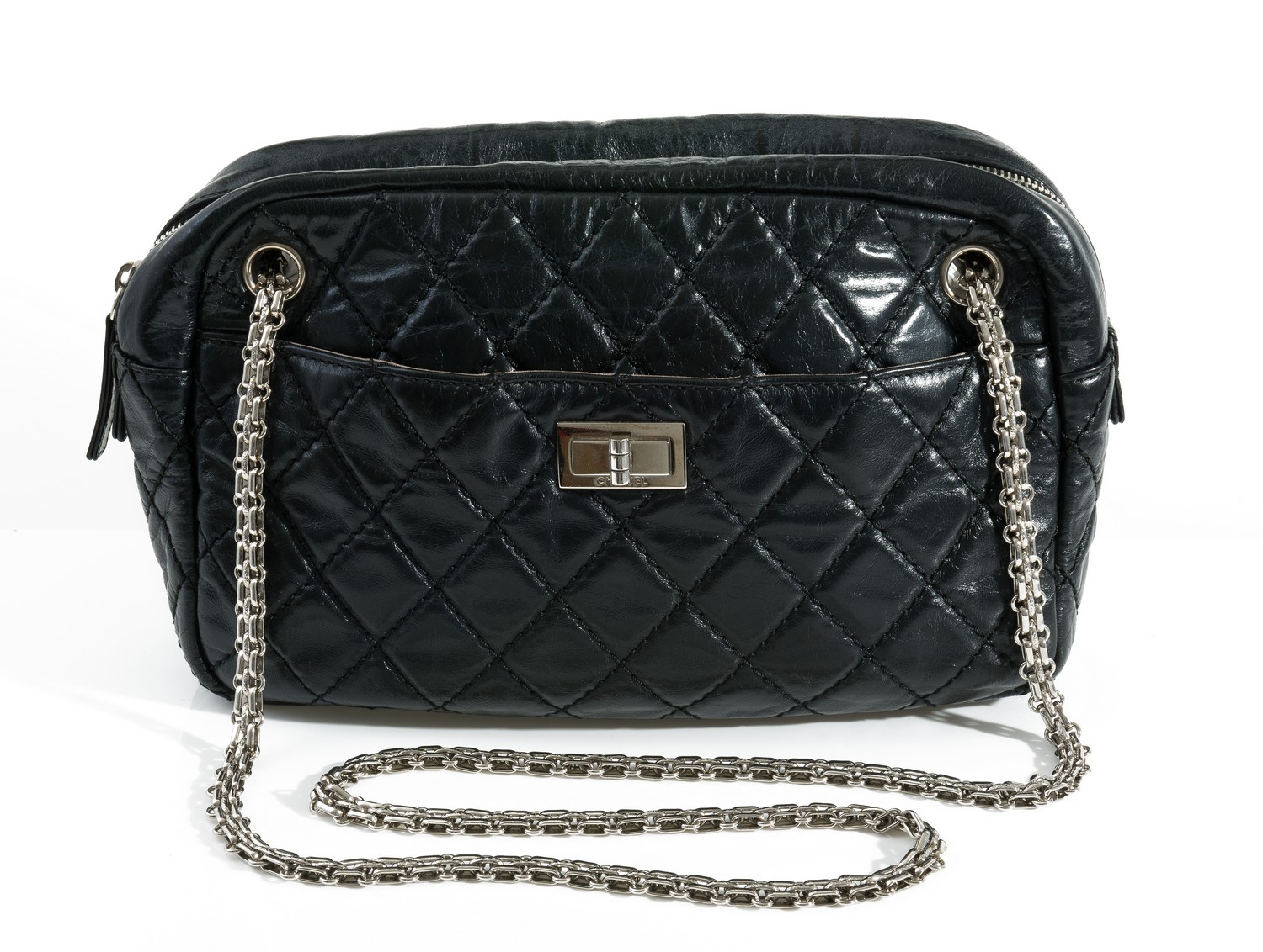 Styled in black quilted textured leather with silver metal hardware and woven chain strap, 26 x 18 x 6cm.