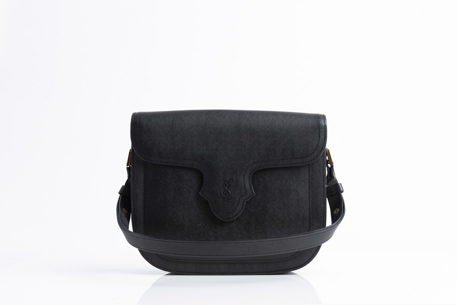 Styled in black leather with gold metal hardware, 21 x 33 x 6cm.