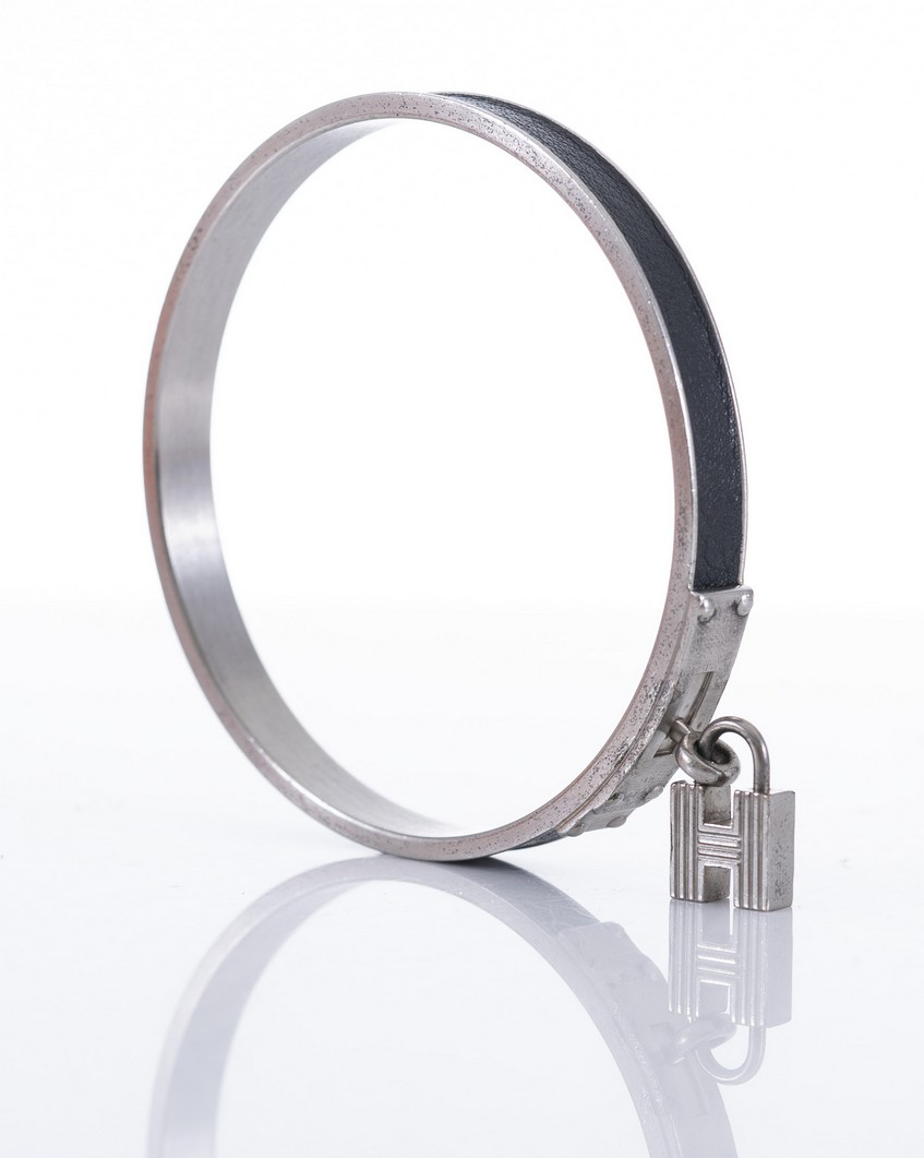Styled in silver and black small grained leather and stainless steel, 6.5cm diameter, boxed.