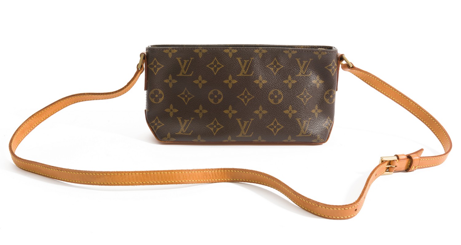 Styled in monogram canvas with tan leather long strap and gold metal hardware, 26 x 12 x 7cm