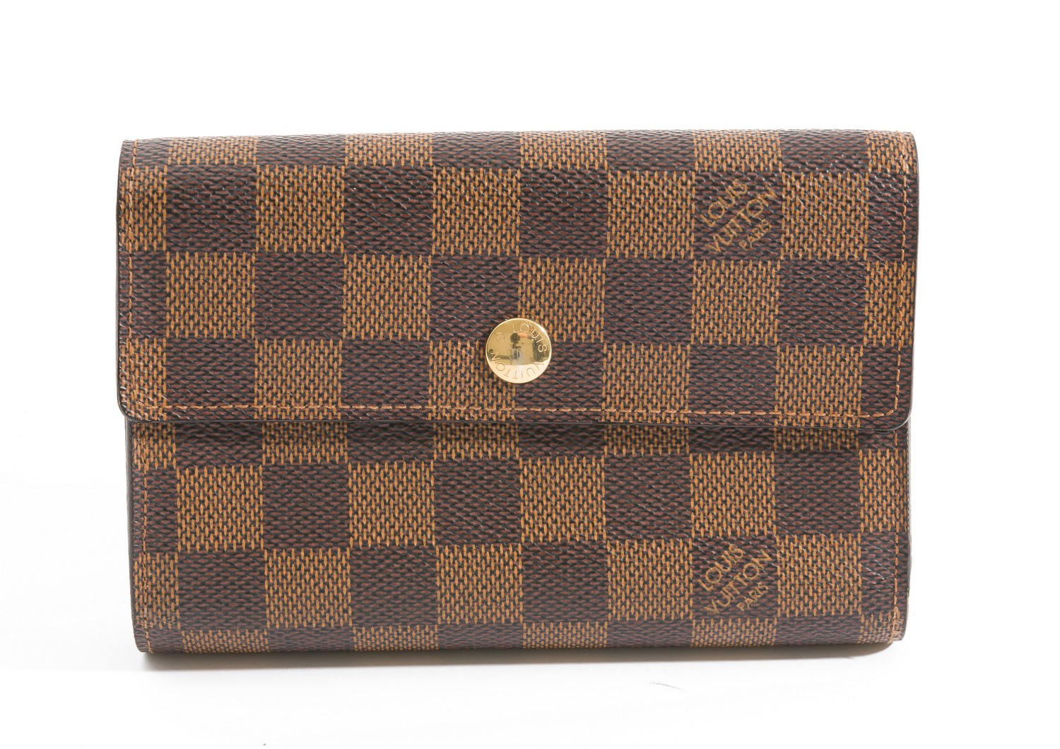 Styled in Damier Ebene canvas with gold metal hardware,15 x 10 x 2.5cm, boxed.