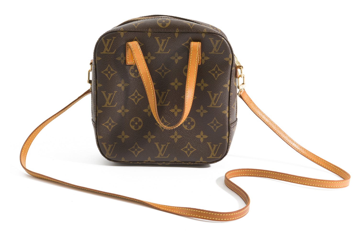 Styled in monogram canvas with tan leather trim and gold metal hardware, 20 x 20 x 7cm.