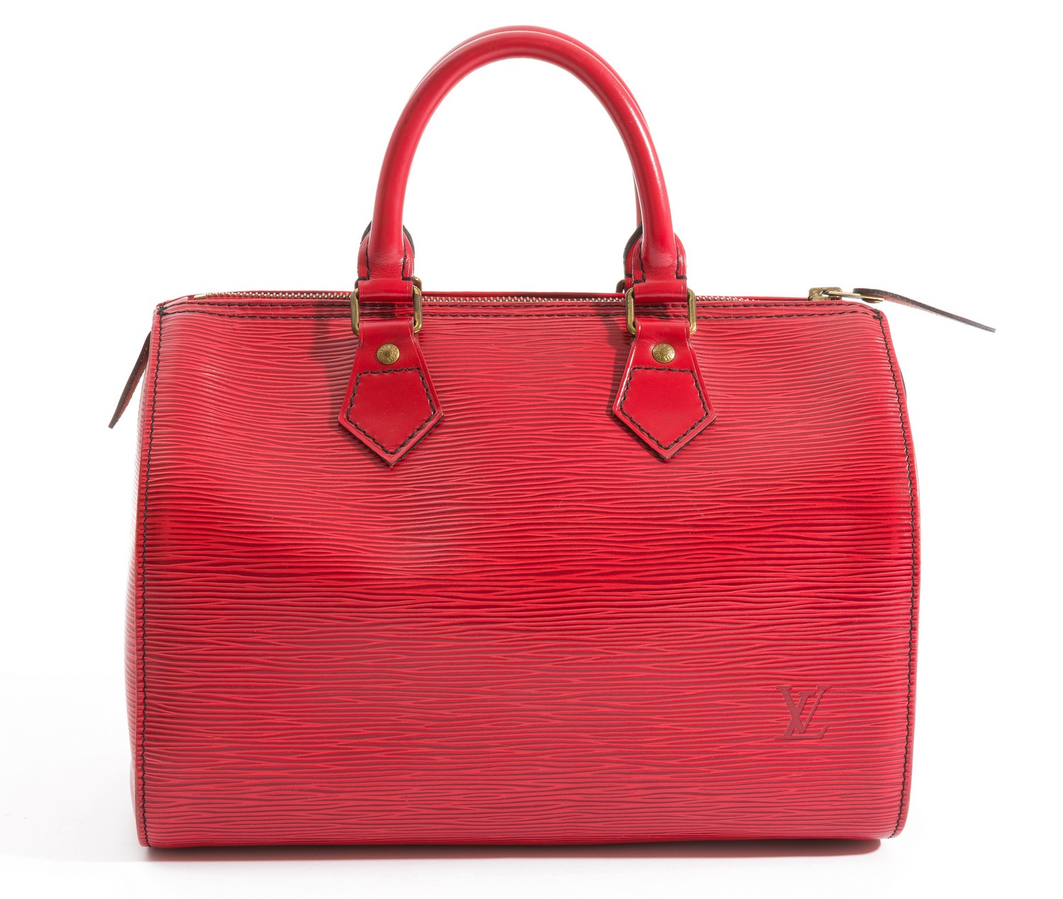 Styled in red Epi leather with leather handles and gold metal hardware, 27 x 19 x 15cm.
