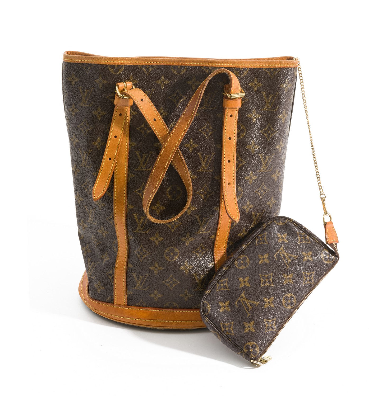 Styled in monogram canvas with tan leather straps and gold metal hardware 27 x 36 x 20cm.