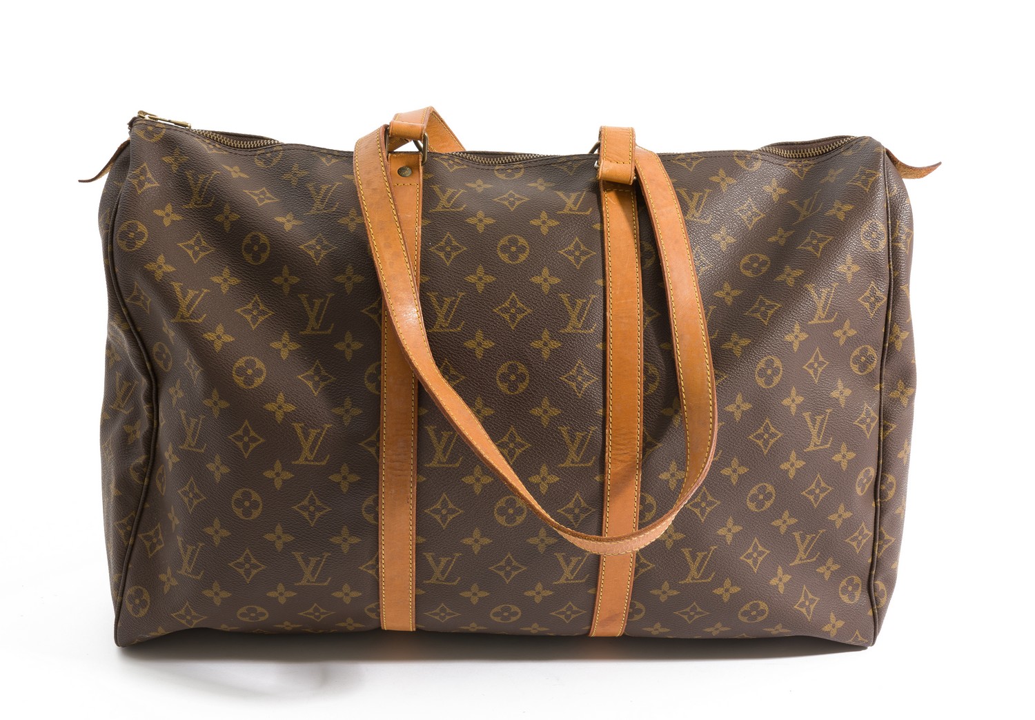 Styled in monogram canvas with tan leather straps and gold metal hardware, 50 x 36 x 14cm.