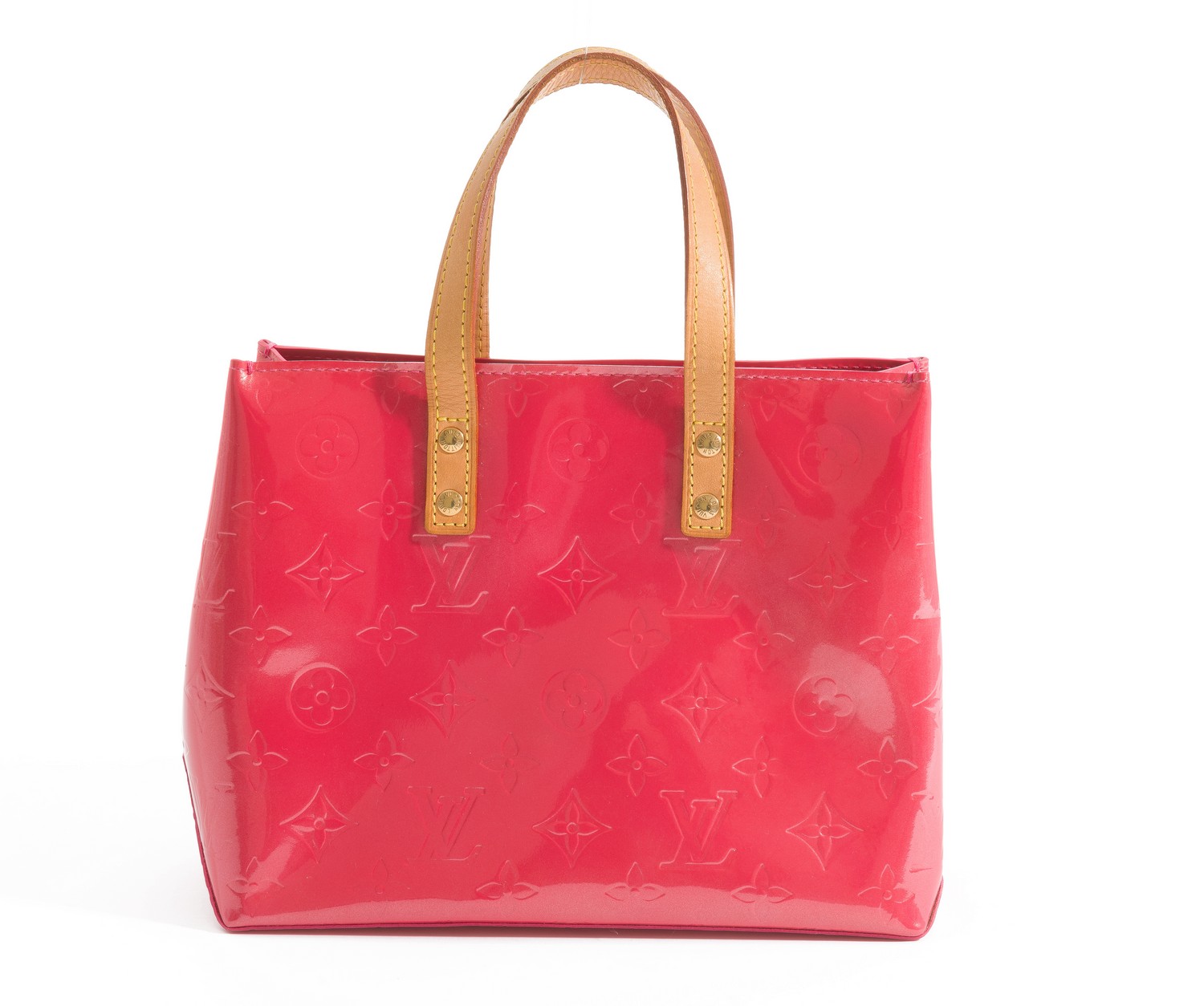 Styled in pink monogram Vernis leather with tan leather handle and gold metal hardware, 23 x 18 x 10.
