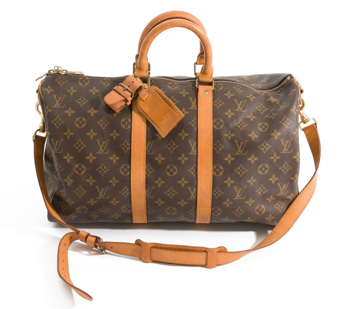 Styled in monogram canvas with tan leather straps and gold metal hardware, 45 x 24 x 20cm.