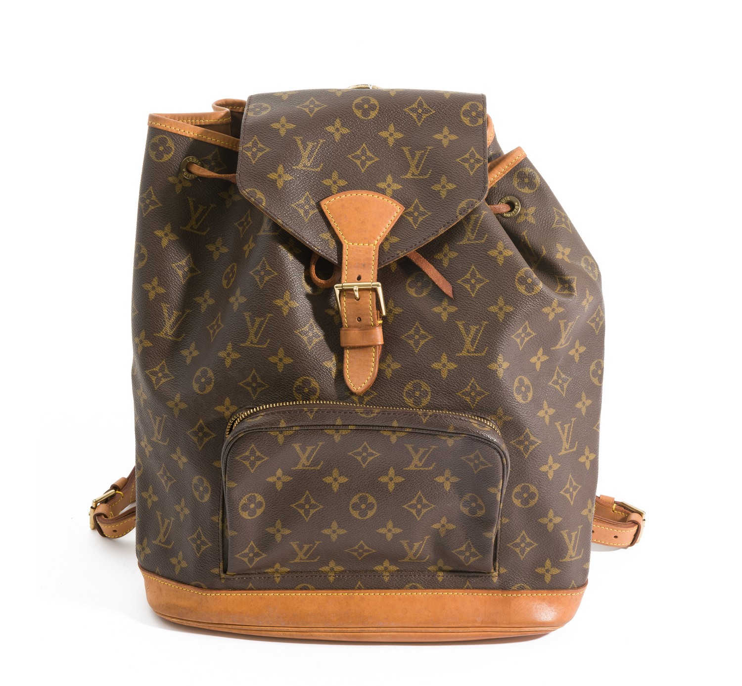 Styled in monogram canvas with tan canvas trim and gold metal hardware, 30 x 35 x 12cm.