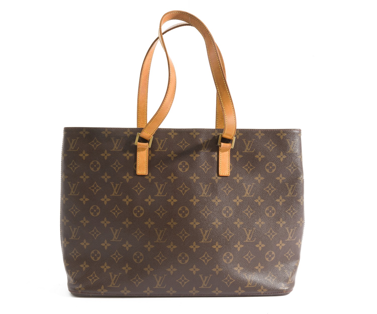 Styled in monogram canvas with tan straps and gold metal hardware, 40 x 30 x 10cm.