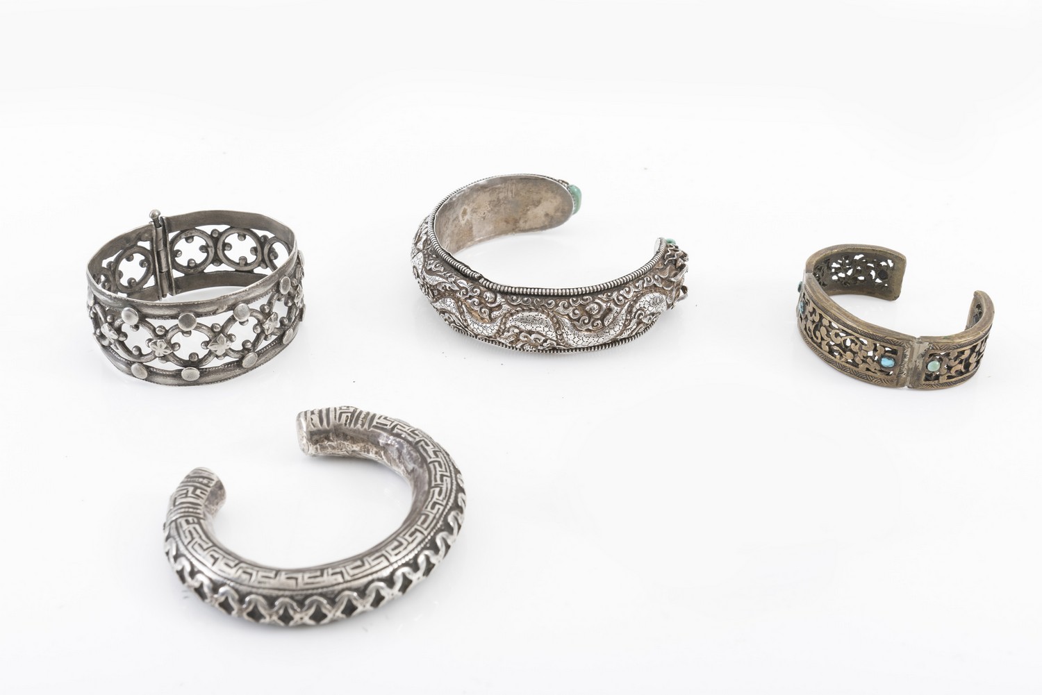 One Tibetan bracelet of repousse silver, depicting two writhing dragons with a turquoise bead in each mouth, another solid bracelet with abstracted geometric motifs, another with openwork circular motifs, the fourth of bronze with turquoise cabochon inlay.