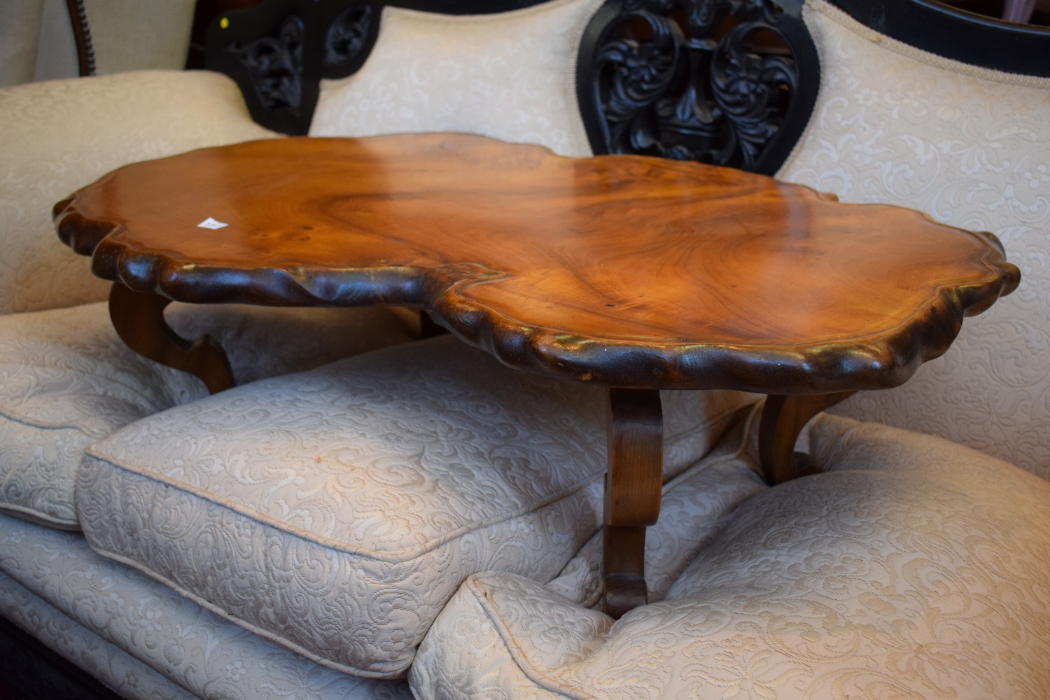 The thick solid slab top of beautifully figured blonde cherry-wood with a naturalistic edge, raised on cabriole legs