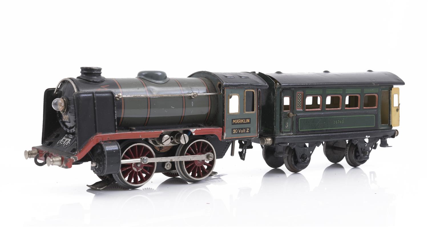 A MARKLIN R900 LOCOMOTIVE AND PASSENGER CAR 18740