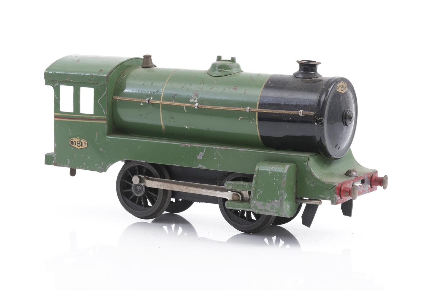 A GREEN PAINTED ROBILT CLOCKWORK 0-4-2 LOCOMOTIVE (NO TENDER OR KEY)