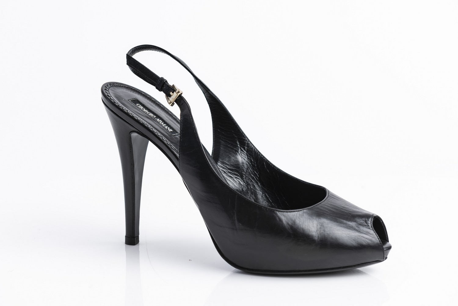 Styled in black leather with gold metal hardware, labelled size 37.5