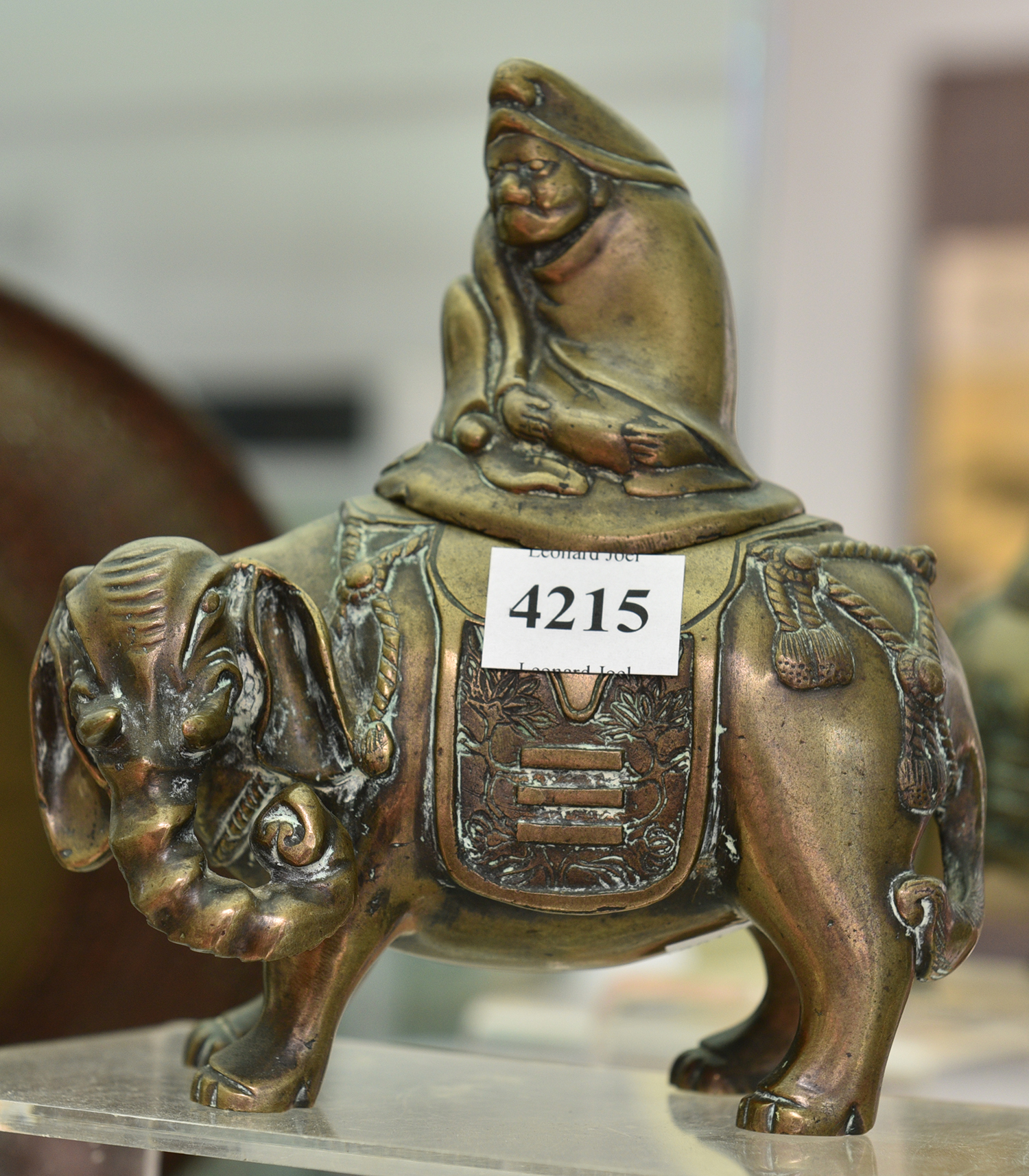 Cast in two parts, in the form of a caparisoned elephant as the base of the censer, with a seated robed male as the lid, with three square holes to the reverse of the figure for the smoke to escape.