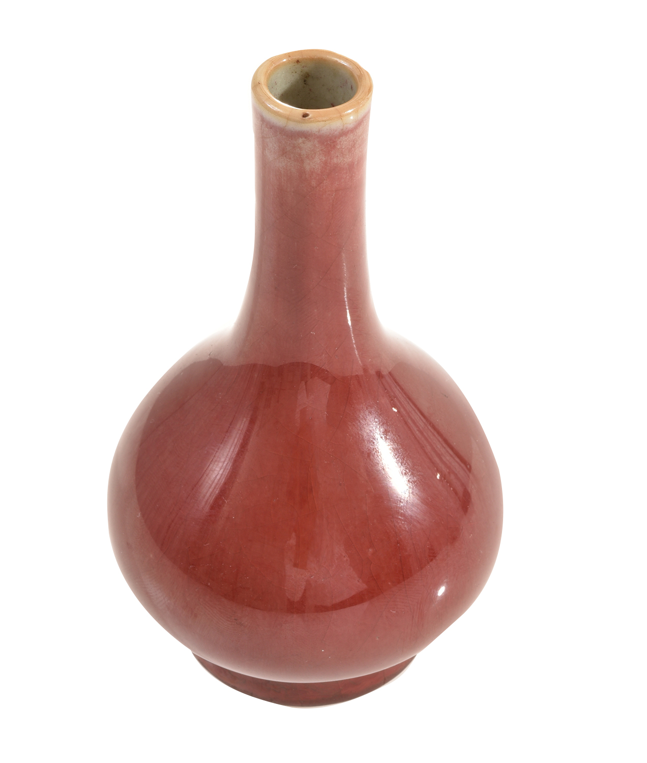 The small vase of pear shape, covered in a beautiful copper red glaze of rasberry hue, thinning at the top to show white streaks of the porcelain beneath, the mouth-rim dressed with pale brown enamel.
