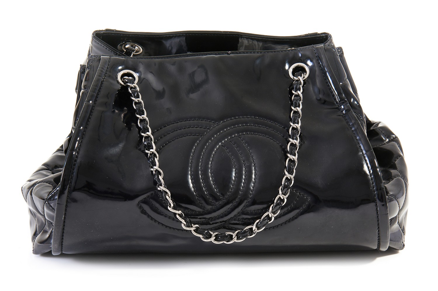 Styled in black vinyl with silver metal hardware and chain weave strap, black and white gingham check interior, 20 x 32 x 20cm.