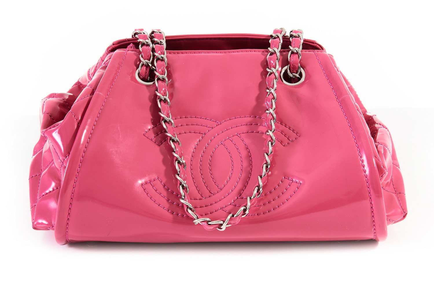Styled in pink vinyl with silver metal chain strap and pink gingham interior, 18 x 25 x 13cm, boxed.