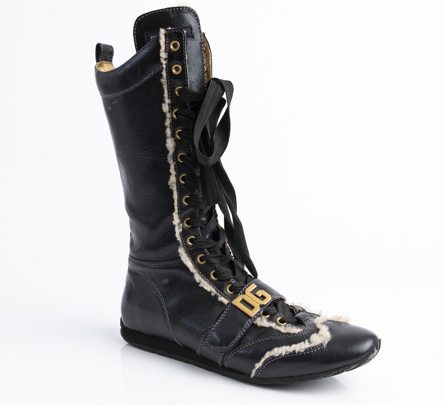 Styled in black leather with shearling detail and gold metal hardware, size 40.