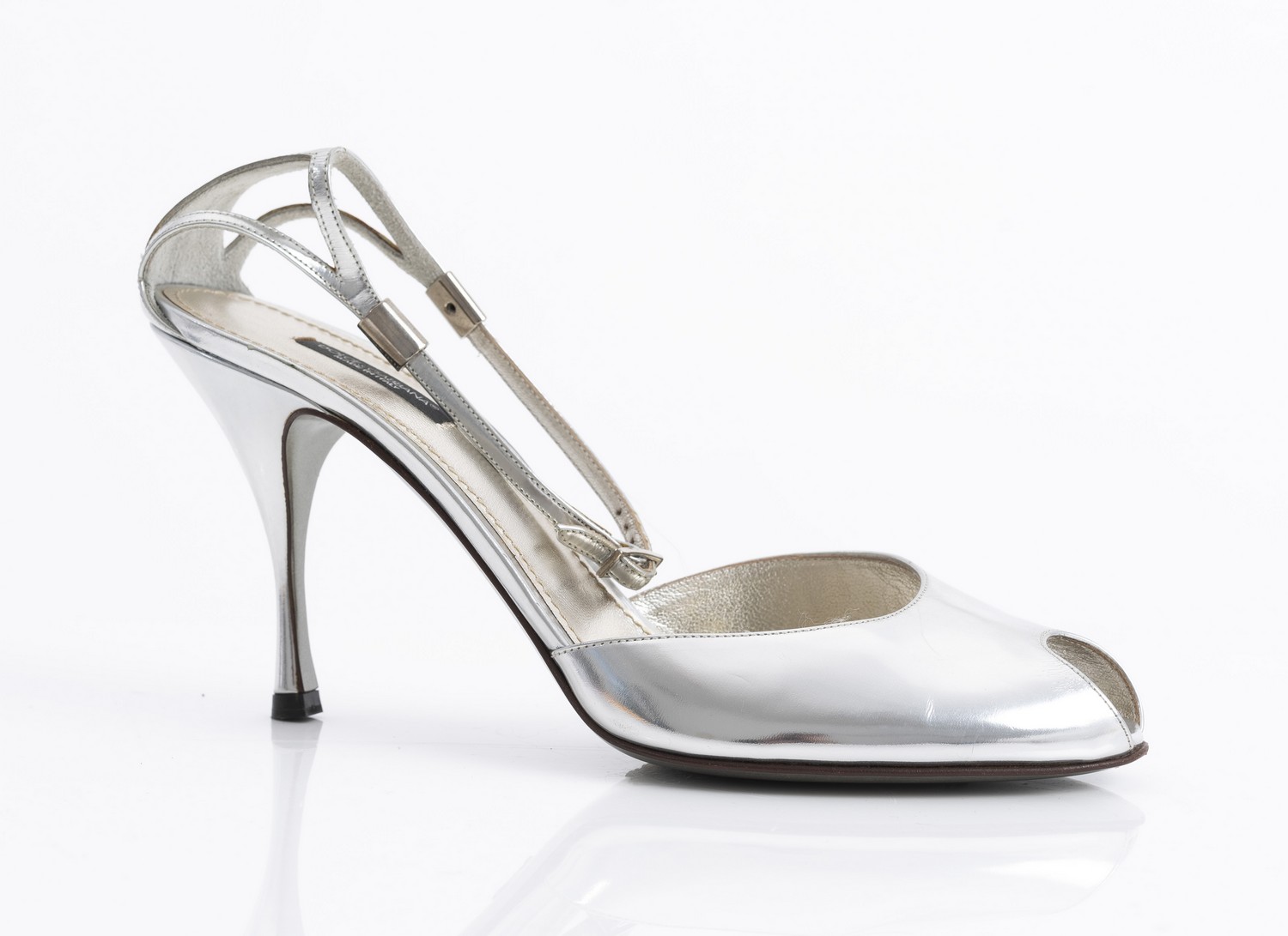 Styled in silver leather with silver metal hardware, labelled size 41.