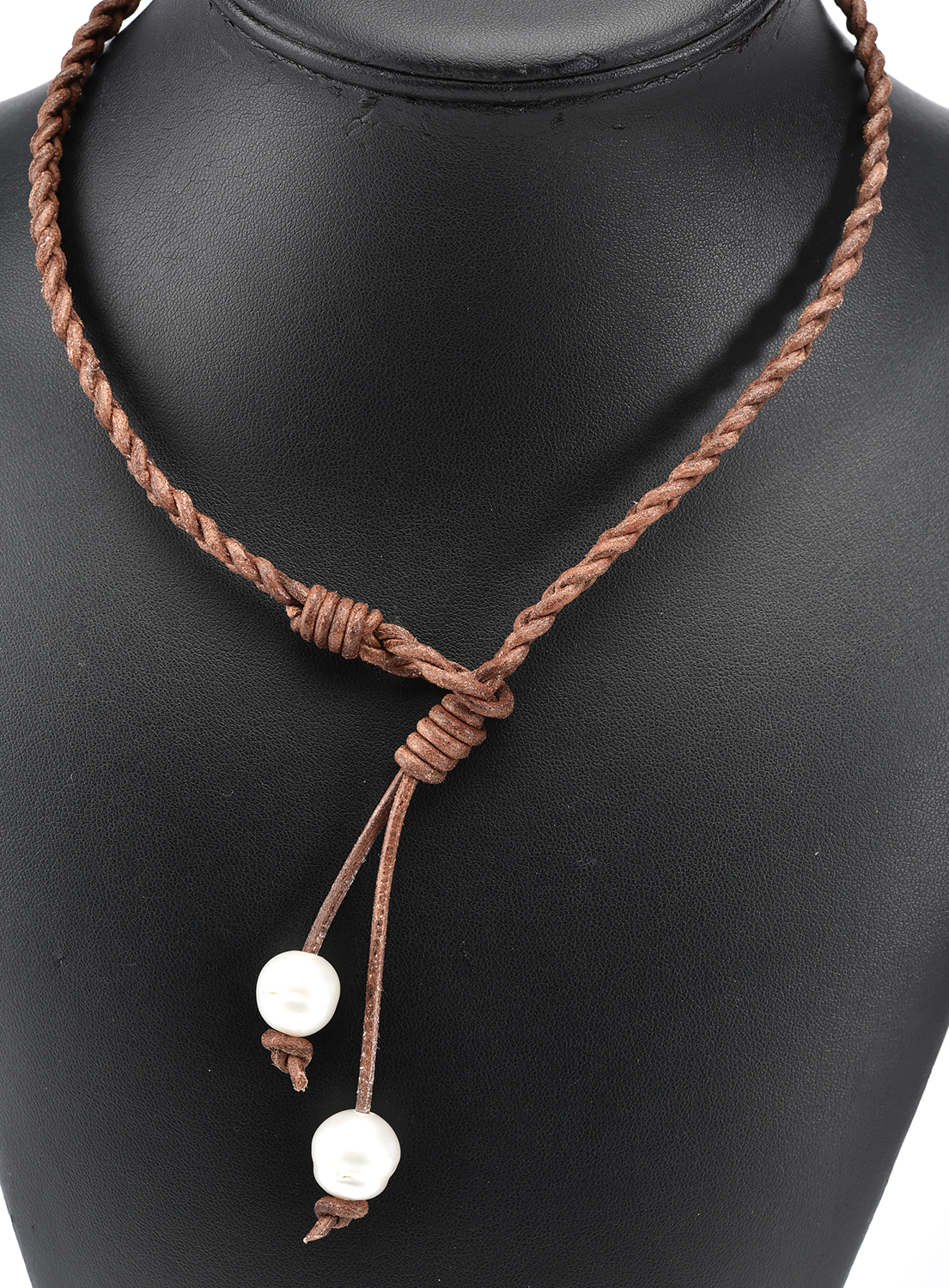 A TAN LEATHER TASSLE NECKLACE WITH TWO SOUTH SEA PEARLS