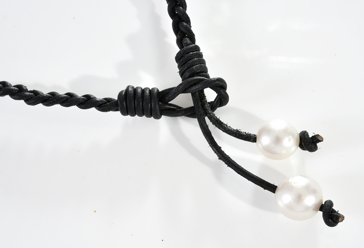 A BLACK LEATHER TASSLE NECKLACE WITH TWO SOUTH SEA PEARLS
