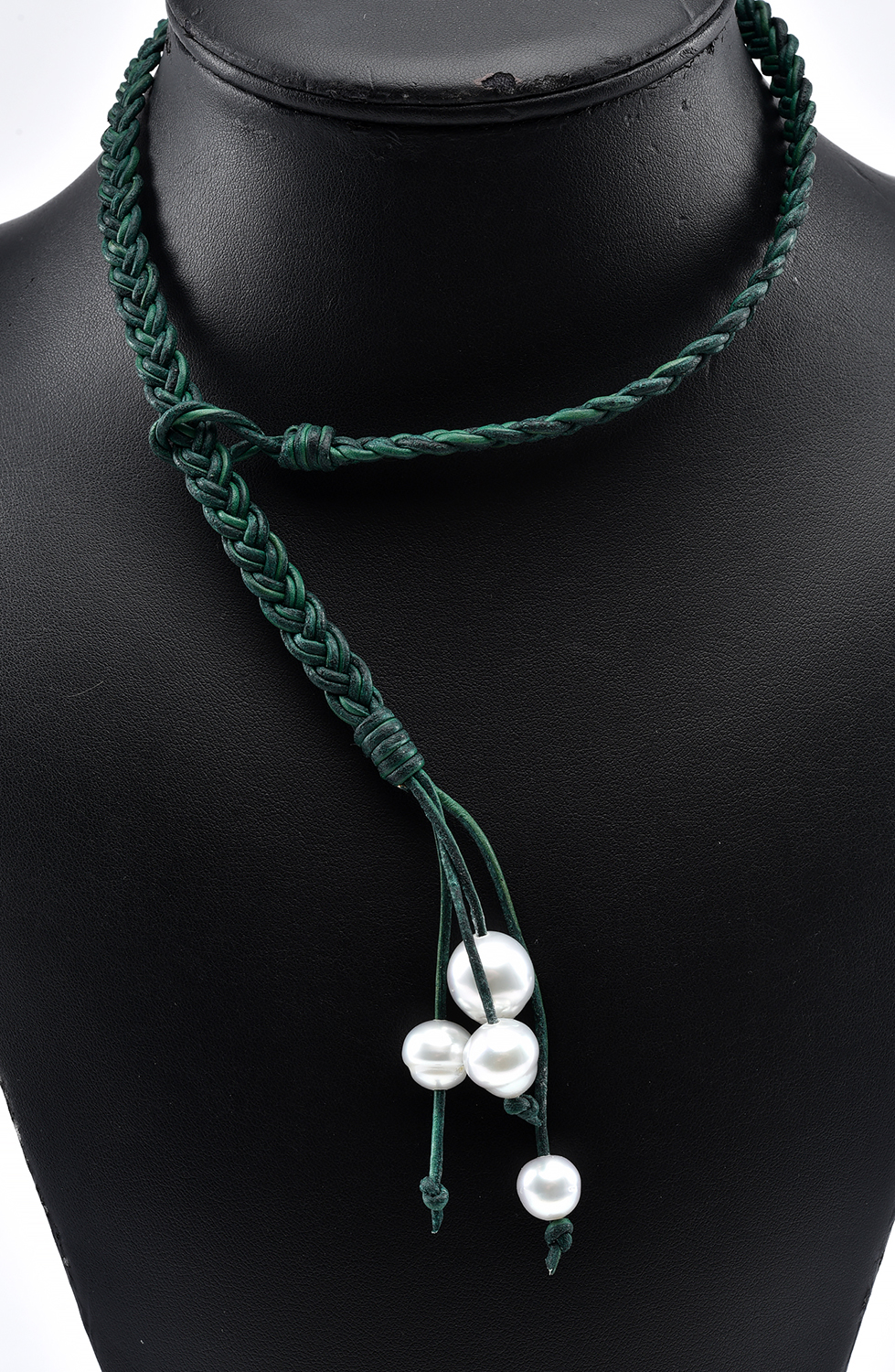 A GREEN LEATHER TASSLE NECKLACE WITH TWO SOUTH SEA PEARLS