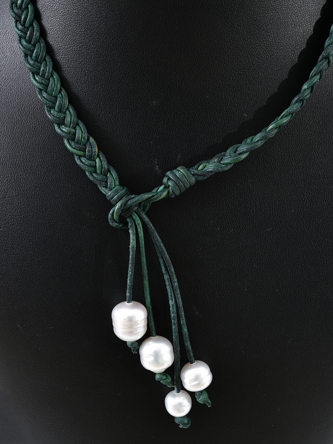 A GREEN LEATHER TASSLE NECKLACE WITH TWO SOUTH SEA PEARLS