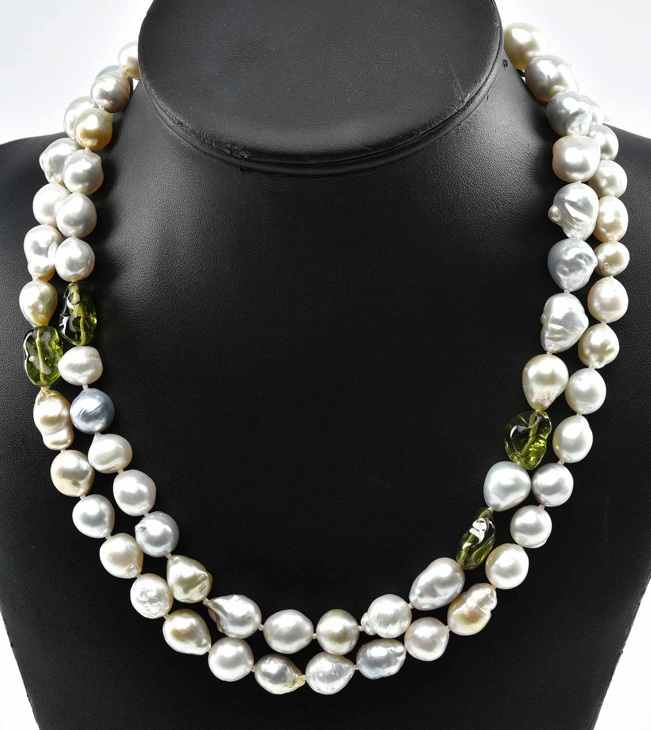 AN OPERA LENGTH SOUTH SEA PEARL AND PERIDOT NECKLACE.