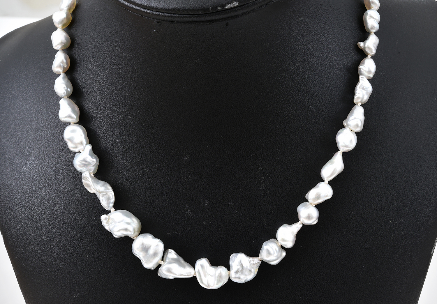 AN AUSTRALIAN KESHI PEARL NECKLACE TO A PEARL SET CLASP IN 9CT GOLD, TOTAL LENGTH 450MM