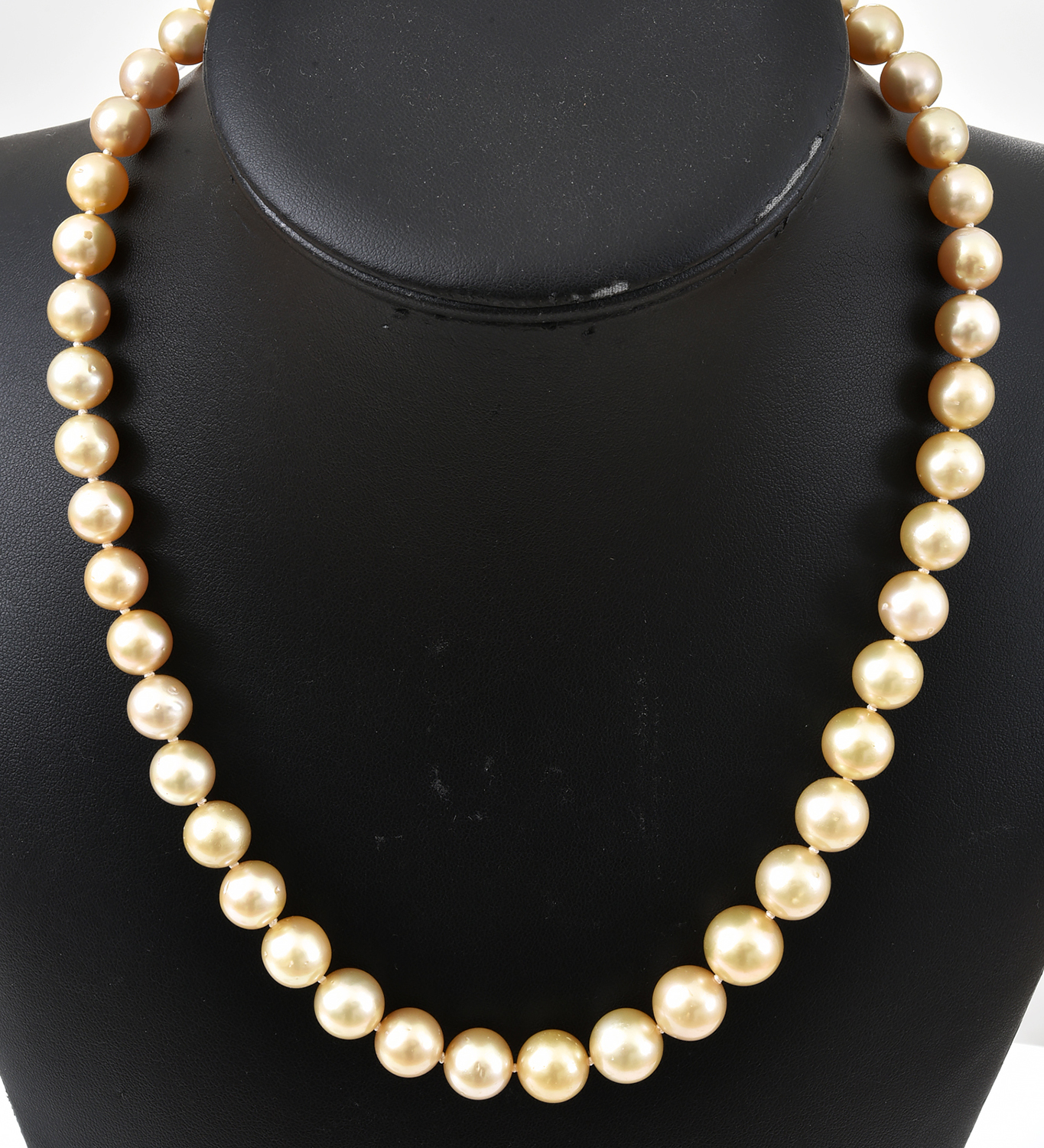A GRADUATED STRAND OF GOLDEN SOUTH SEA PEARLS (9-12MM) TO AN INVISIBLE PEARL CLASP, TOTAL LENGTH 500MM