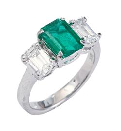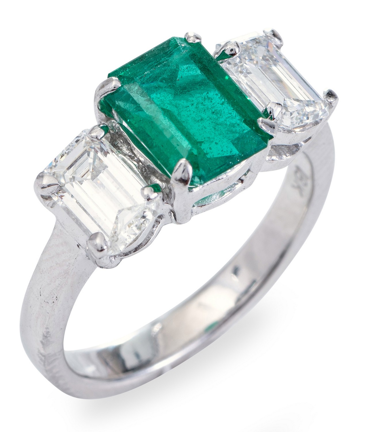 The emerald cut emerald weighing 1.78cts, flanked by emerald cut diamonds totalling 1.40cts, in 18ct white gold, ring size M.