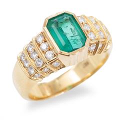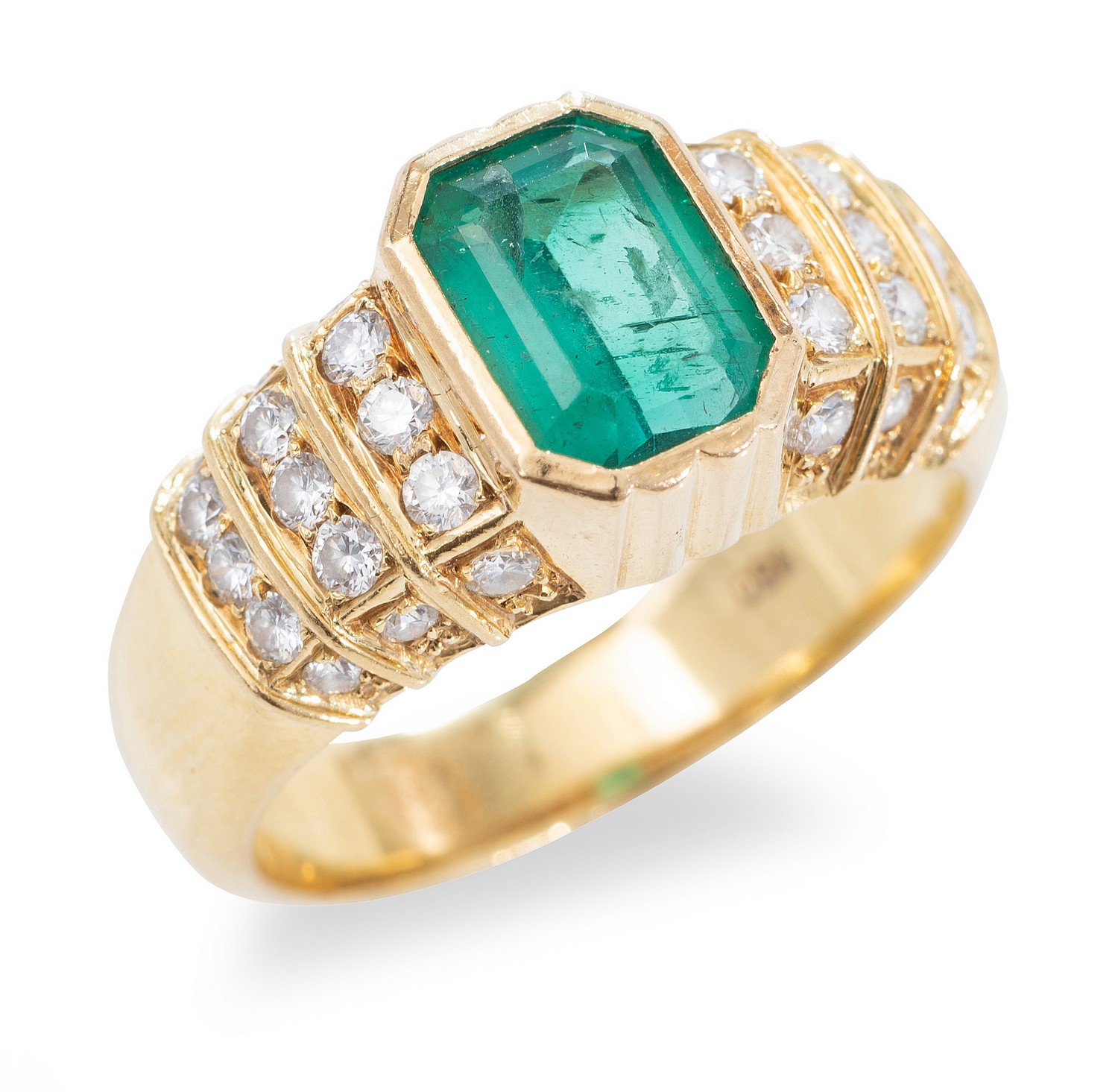 The emerald cut emerald weighing 1.80cts, having stepped shoulders set with three rows of round brilliant cut diamonds totalling 0.52cts, in 18ct gold, ring size R.