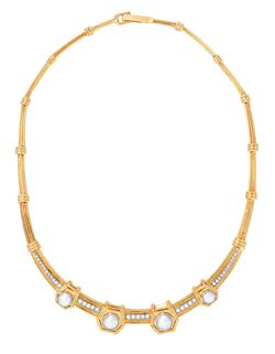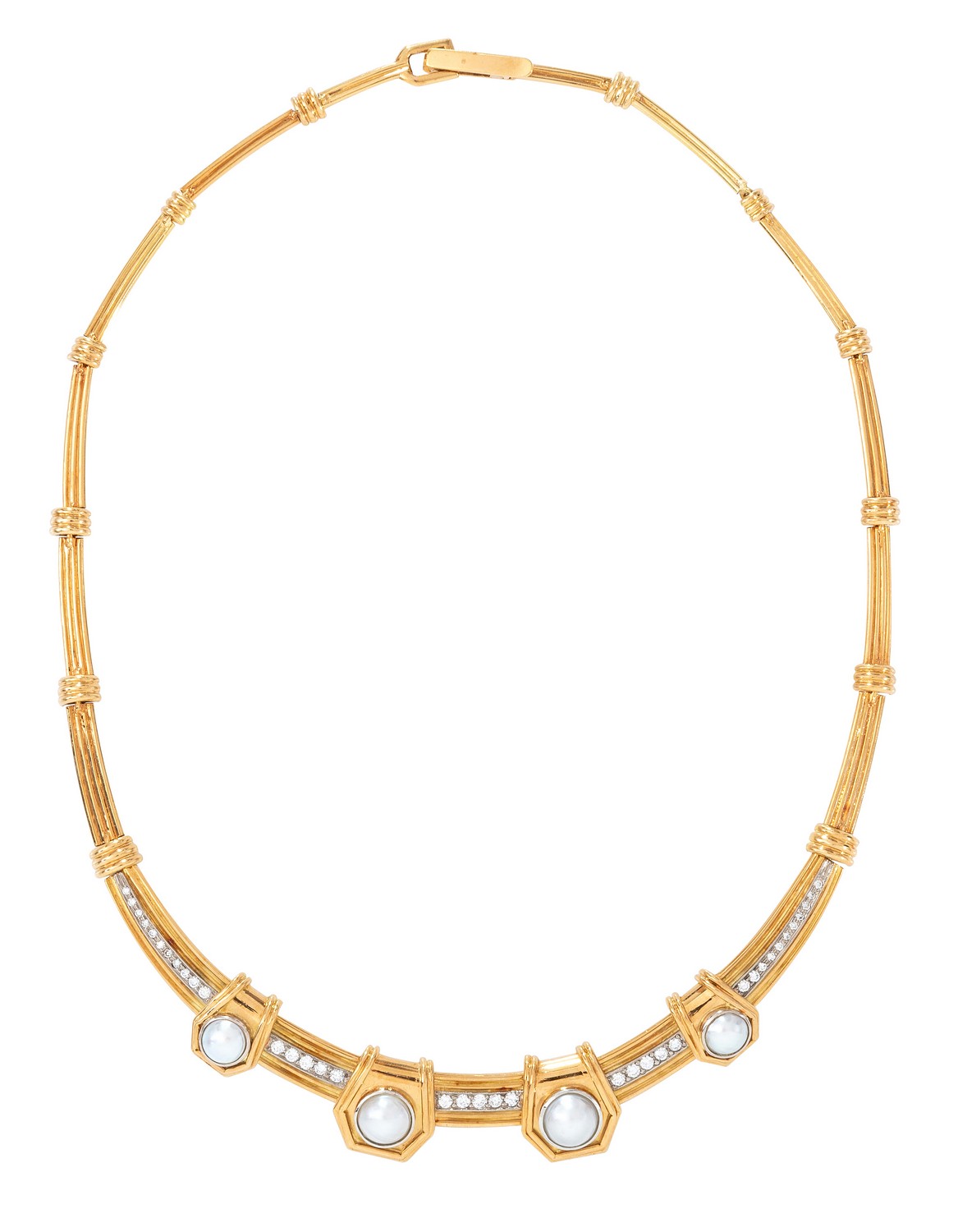 Comprising a demi lune panel bezel set with four mabe pearls in shield shaped frames interspaced by panels of graduated round brilliant cut diamonds, totalling an estimated 1.25cts, suspended on reeded panels, in 18ct gold.