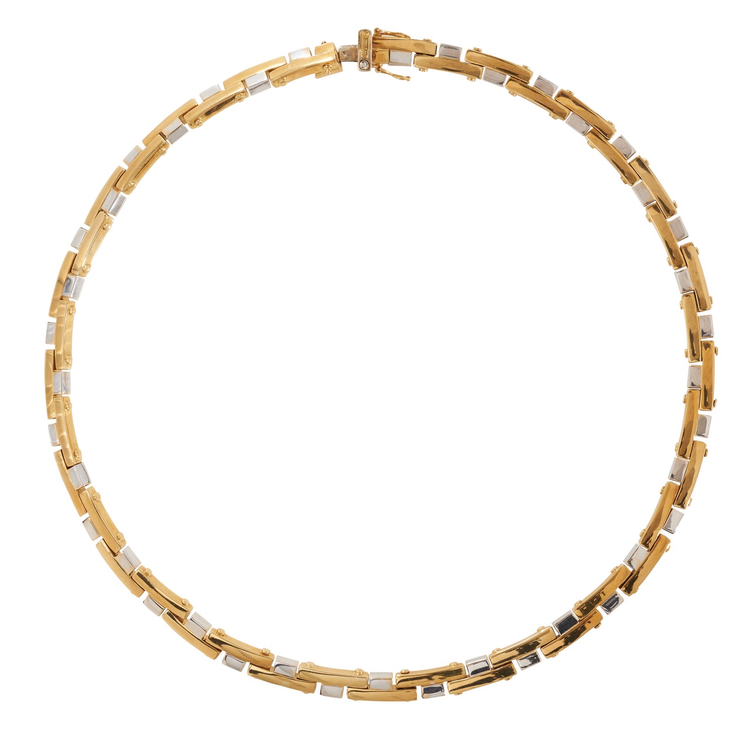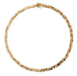 Of curved brick link design, comprising panels in 18ct white and yellow gold, to a diamond set clasp, signed, total length 500mm.