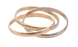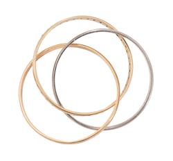 Designed by Catanach's, comprising interlocking bangles, one hammer set with round brilliant cut diamonds, all in 18ct yellow, rose and white gold.