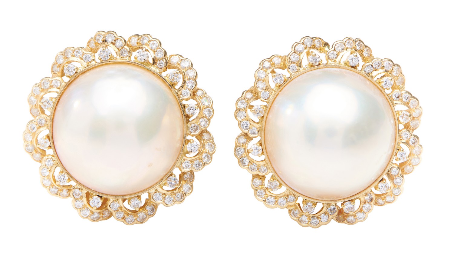 Each earring comprising a mabe pearl within a scalloped border set with round brilliant cut diamonds, to clip fittings, in 18ct gold.