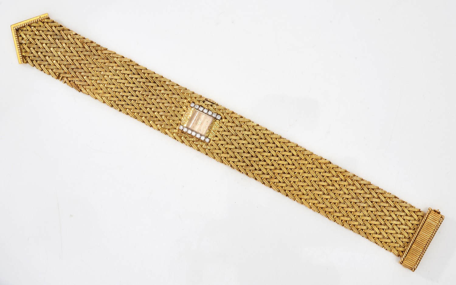 Manual wind movement, square gilded dial with gold baton numerals, diamond bezel, to integral fancy link bracelet bands with decorative buckle clasp, all in 18ct gold, dial 10mm square, total length 220mm.