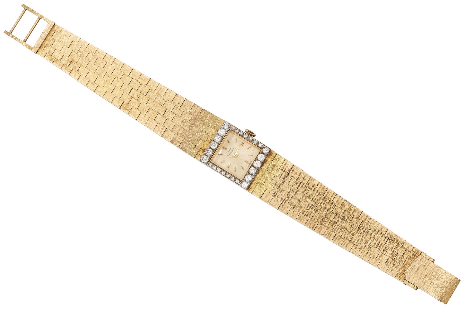 Manual wind movement, square gilded dial with gold baton numerals, diamond bezel, to integral bracelet bands in textured finish, in 12ct gold (XRF tested), dial 13mm square, total length 170mm.