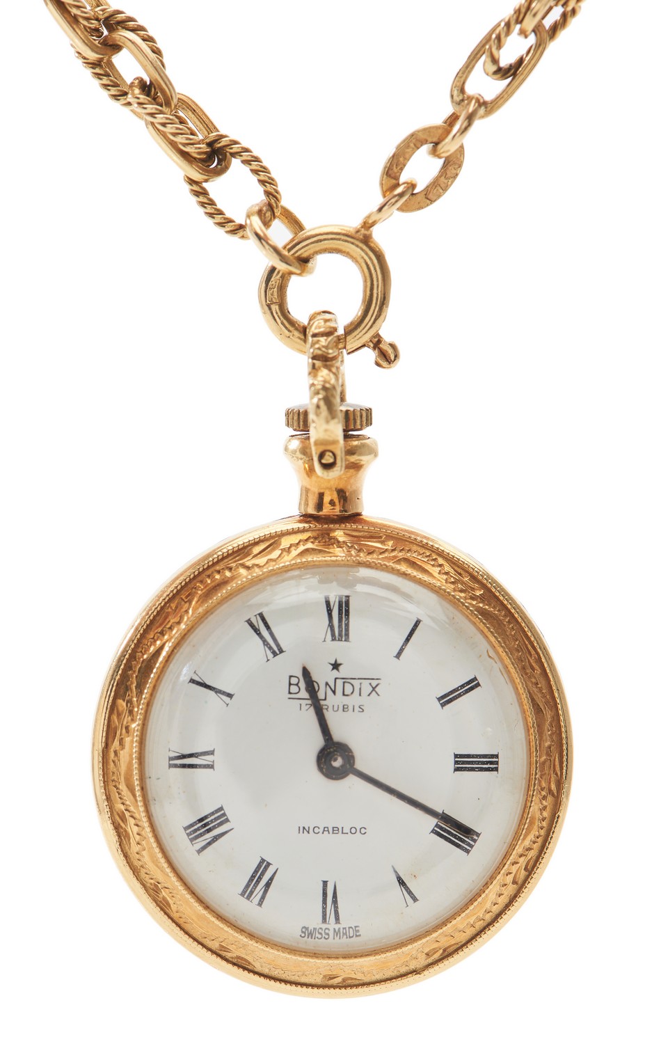 Crown wind and set movement, circular white dial with black Roman numerals signed Bondix, 18ct gold engraved case, diameter 24mm, suspended on a fancy link chain in 18ct gold, total length 840mm.