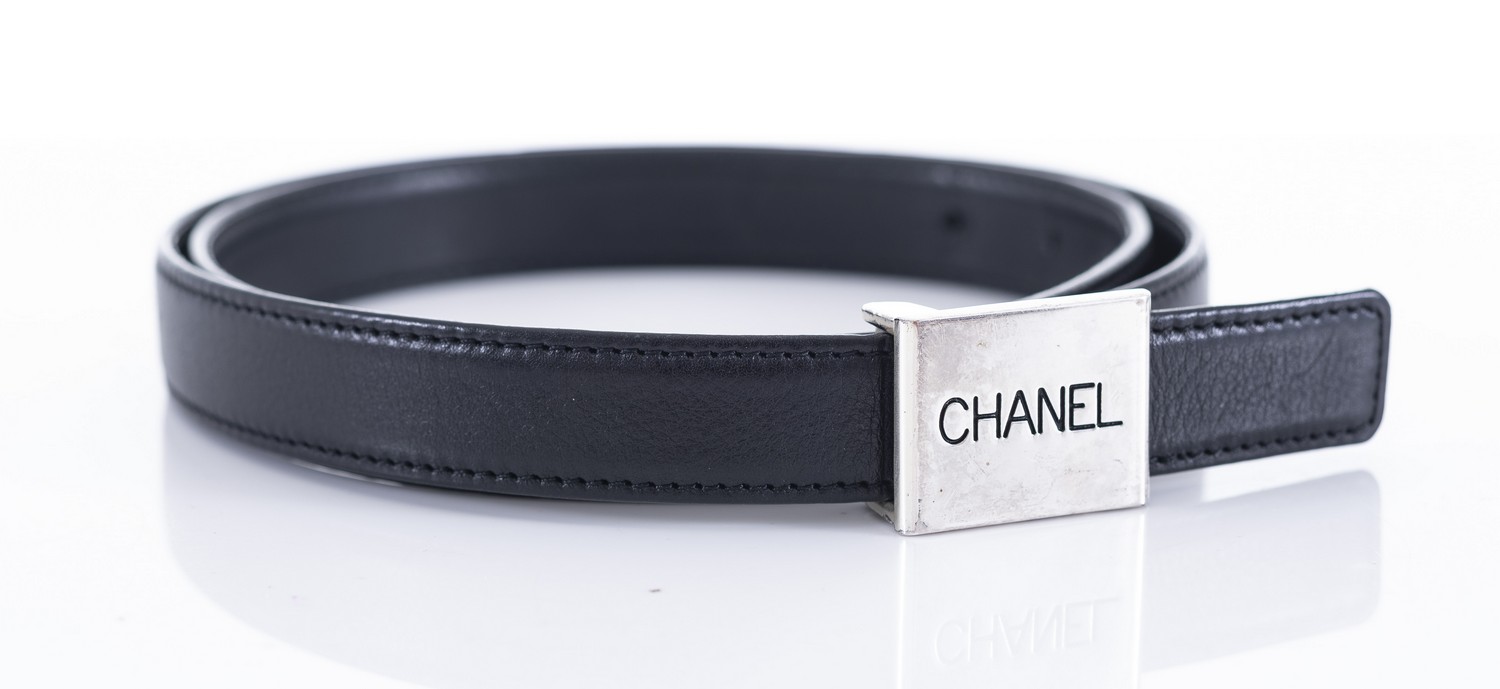 Styled in black leather with silver metal hardware and logo buckle, stamped 75/30, boxed.