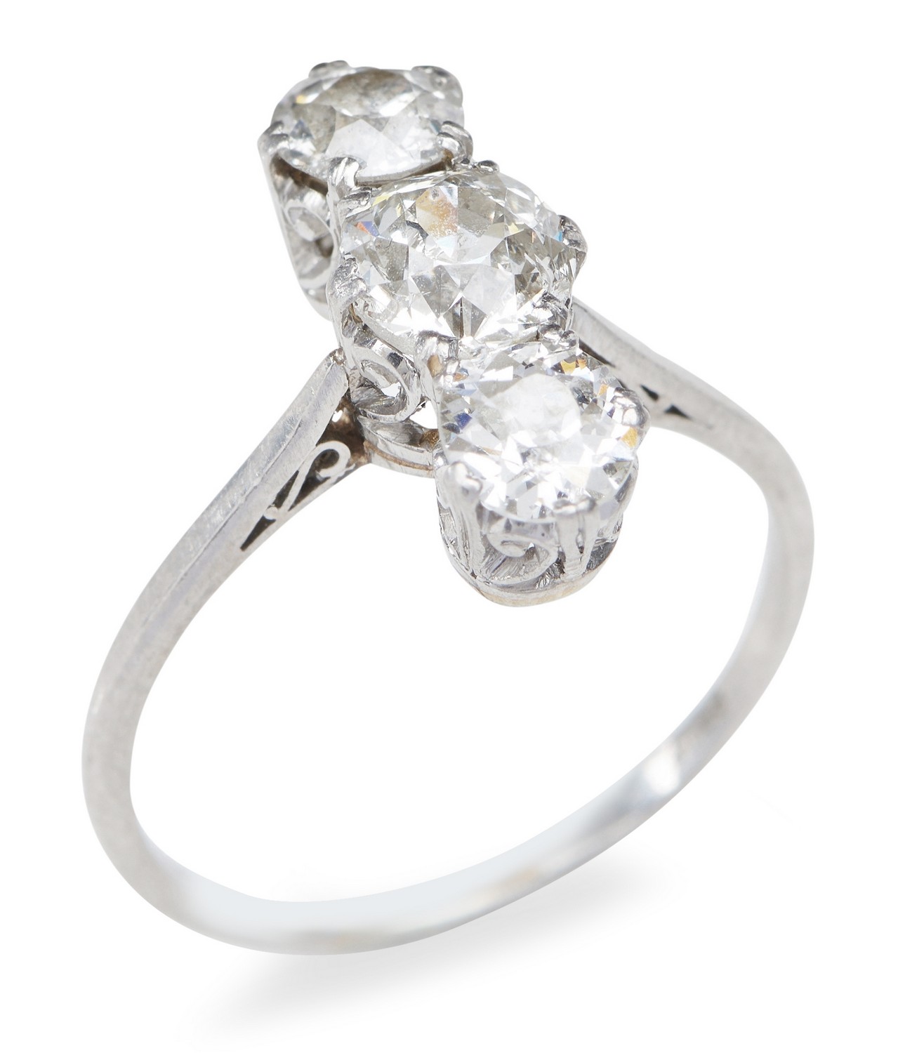 Comprising three old European cut diamonds totalling an estimated 1.0ct, in platinum, ring size K 1/2.