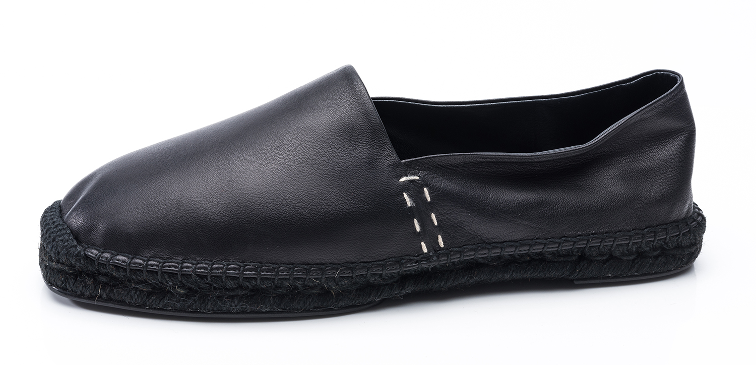Styled in black leather with white contrast stitching, size 11D, boxed.