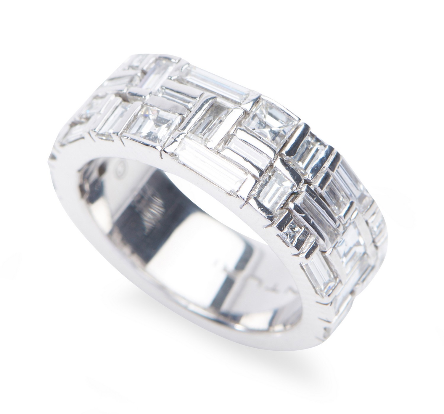 From the 'Cubism' range, the wide band set with baguette and carré cut diamonds, in 18ct white gold, ring size O.