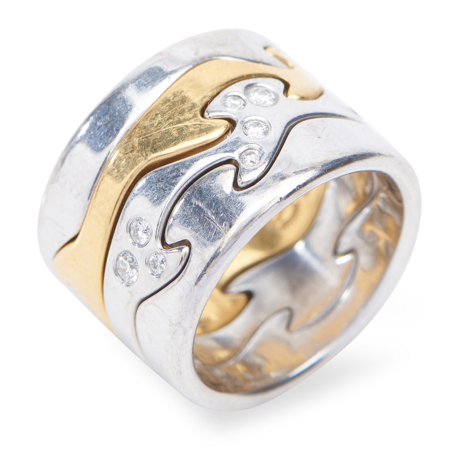 From the 'Fusion' range, comprising four fitted bands, one with hammer set round brilliant cut diamonds, in two-tone 18ct gold, reference 50 NK, ring size L-M.
